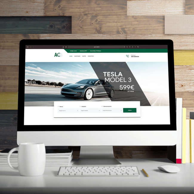 Creazione del brand AC Rent: logo, immagine coordinata e sito web ad hoc, con la possibilità di ricercare oltre 100 auto